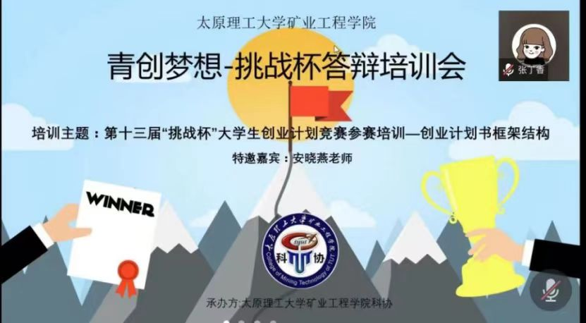 4月19日晚7时,矿业工程学院采用线上线下相结合的方式面向全校同学举办青创梦想系列活动之第十三届“挑战杯”大学生创业计划竞赛赛事培训。此次培训旨在促进学生对“挑战杯”大赛的认识了解,明晰参赛学生对作品撰写的思路规划,培养大学生勇于探索、积极实践的坚毅品格。院长董宪姝、团委书记张丁香、科技竞赛负责人王佩出席了培训,由校团委科技实践部部长安晓艳进行培训。